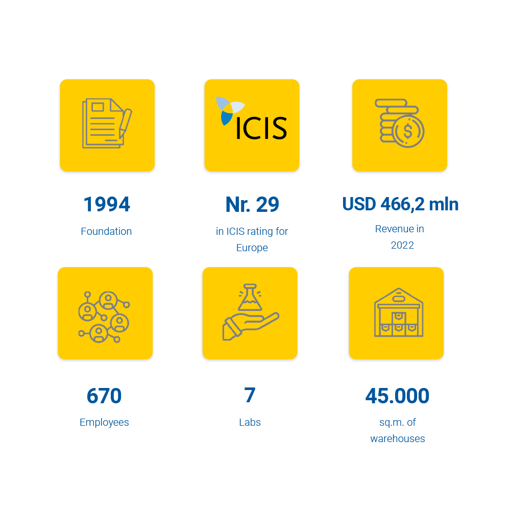 Şu anda, 350’den fazla yabancı üreticiye kimyasal ürün ve hammadde tedarik ediyoruz. Biz yabancı tedarikçilerimizin çoğunun resmi dağıtıcısıyız ve onların kimyasal ürünlerinin pek çoğunun Rusya ve Bağımsız Devletler Topluluğuna tedarik edilmesi için münhasır haklara sahibiz. Ofislerimiz ve depolarımız Rusya, Kazakistan, Özbekistan, Belarus, Çin, Hindistan ve Türkiye'nin pek çok şehrinde bulunmaktadır. Şirketin merkez ofisi ve yönetimi Saint-Petersburg’da bulunmaktadır.