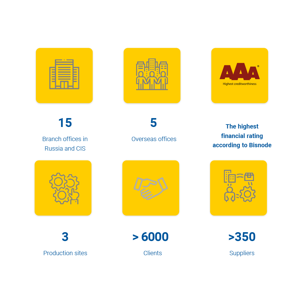 Müşterilerimizin “tek noktada hizmet sunumu” ilkesiyle maliyetleri düşürmelerini sağlayan, her faaliyet alanında geniş bir ürün yelpazesi sunuyoruz. Müşterilerin stok hacmini asgariye indirmemize ve günlük teslimatlar yapmamıza imkan veren emrimizde 10 modern depo bulunmaktadır. Güvenilir iş ortaklarımıza iyi ödeme koşulları sunuyoruz. Müşterilerimizi desteklemek ve yeni ürünler ve çözümler sunmak üzere beş laboratuvarımız bulunmaktadır. Ürünlerin bir kısmını Rusya, Avrupa ve Asya’nın en iyi kuruluşlarında üretim yaptırarak kendi markamız altında kaliteye oranla en uygun fiyatla satıyoruz. Tüm ürünlerimiz yürürlükteki yönetmelik uyarınca belgelenmektedir.